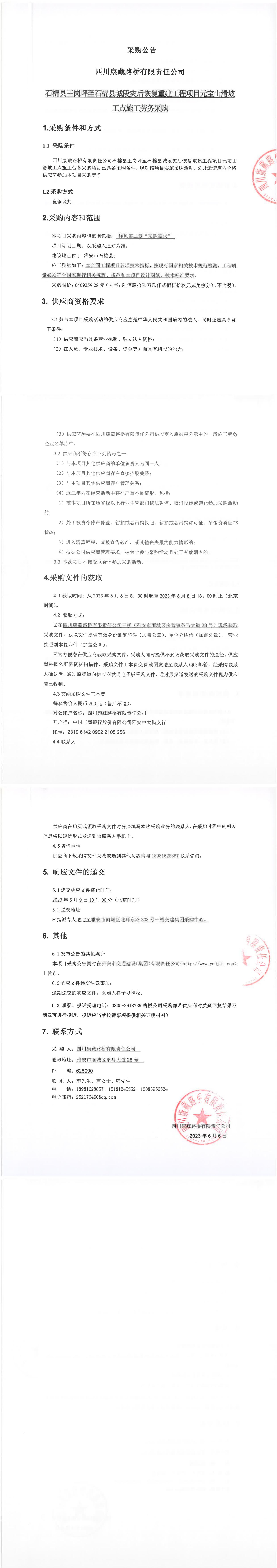 四川康藏路橋有限責任公司石棉縣王崗坪至石棉縣城段災后恢復重建工程項目元寶山滑坡工點施工勞務采購