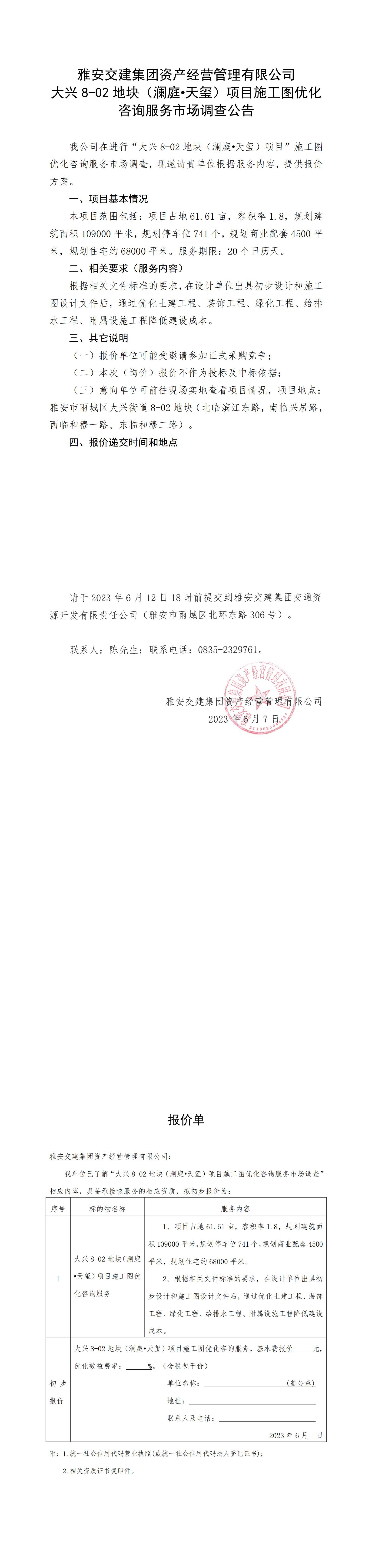 雅安交建集團資產(chǎn)經(jīng)營管理有限公司大興8-02地塊(瀾庭·天璽)項目施工圖優(yōu)化咨詢服務(wù)市場調(diào)查公告