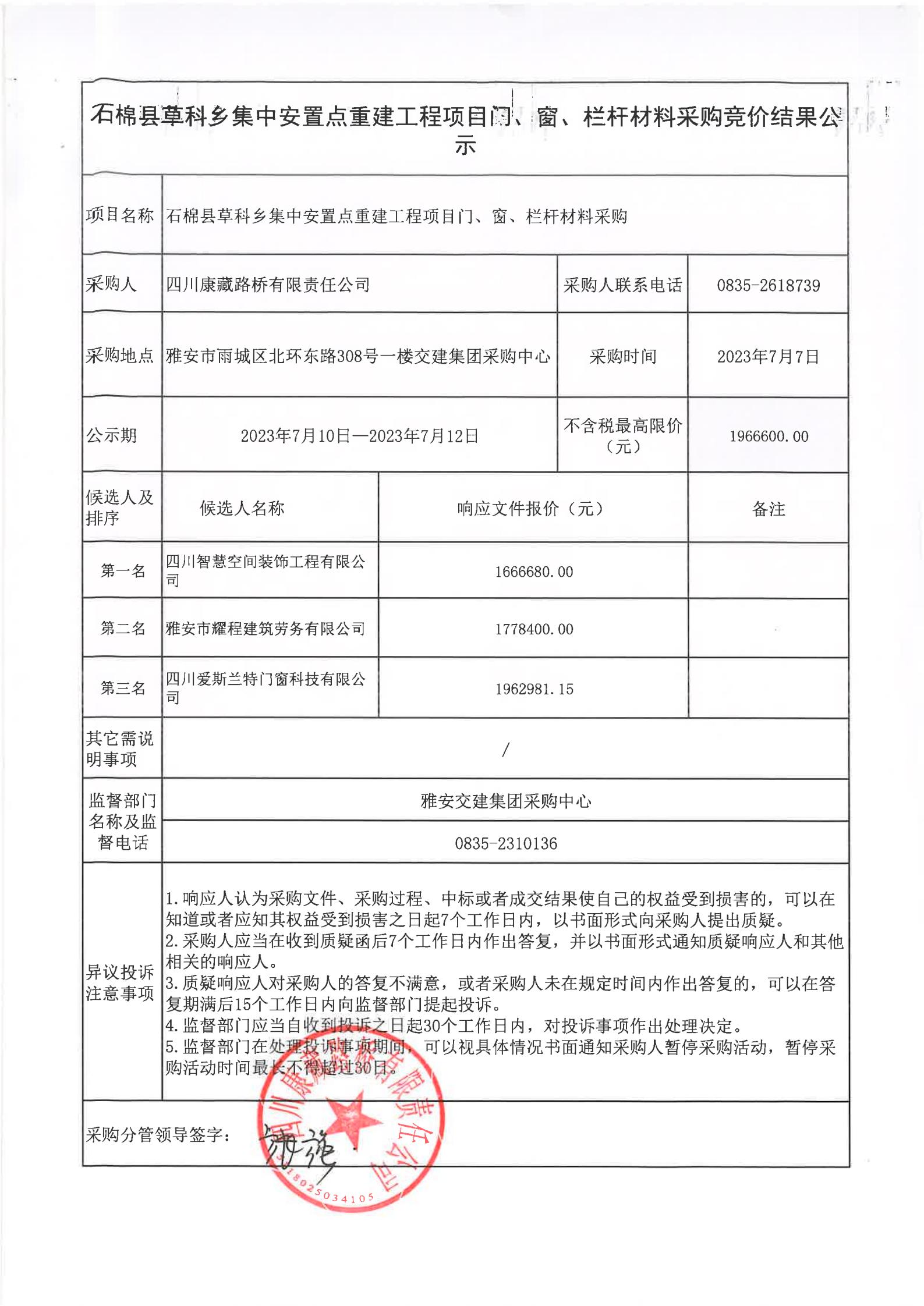 四川康藏路橋有限責(zé)任公司石棉草科鄉(xiāng)集中安置點(diǎn)重建工程項(xiàng)目門、窗、欄桿材料采購競(jìng)價(jià)結(jié)果公示