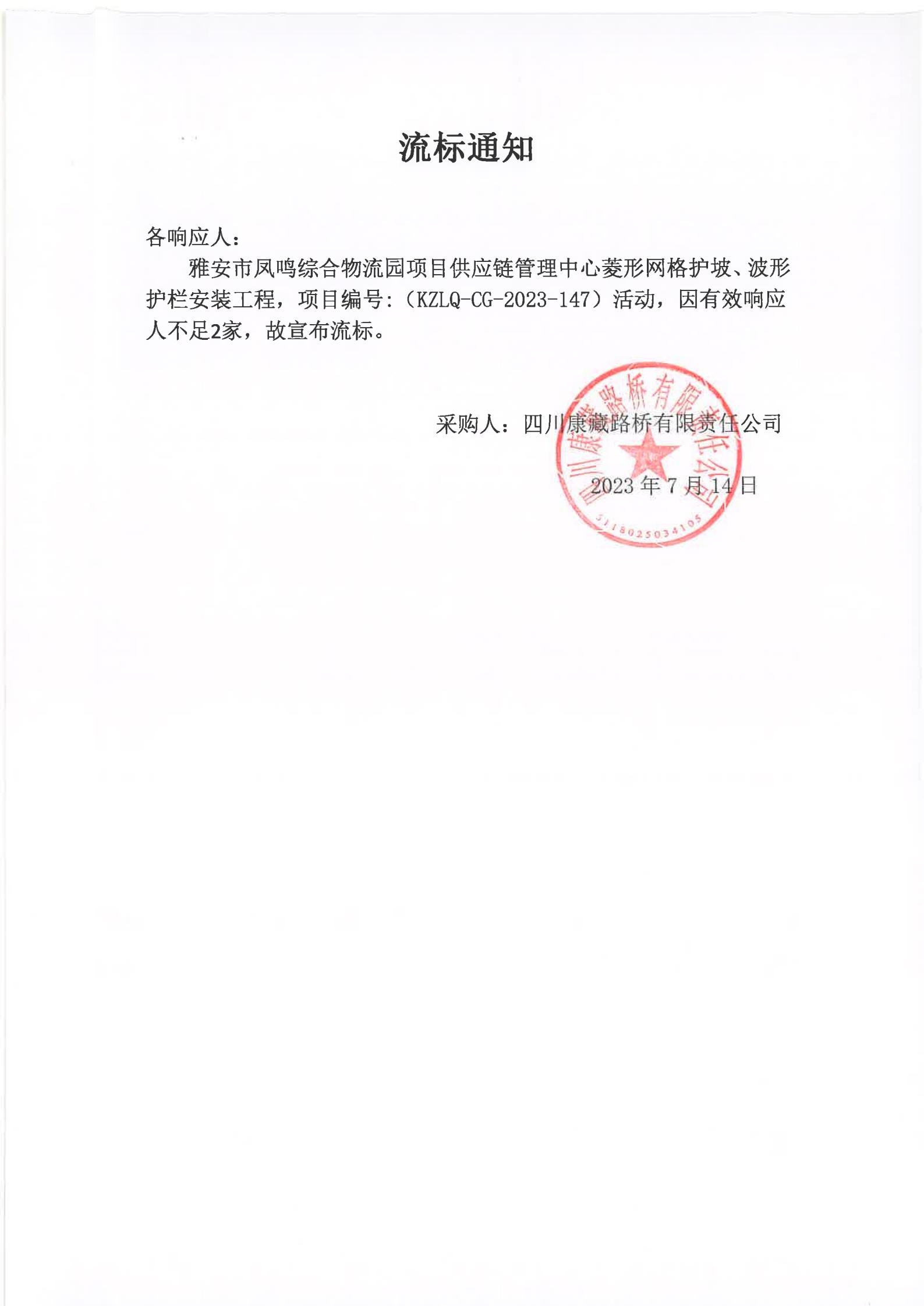 四川康藏路橋有限責(zé)任公司雅安市鳳鳴綜合物流園項(xiàng)目供應(yīng)鏈管理中心菱形網(wǎng)格護(hù)坡、波形護(hù)欄安裝工程采購流標(biāo)通知
