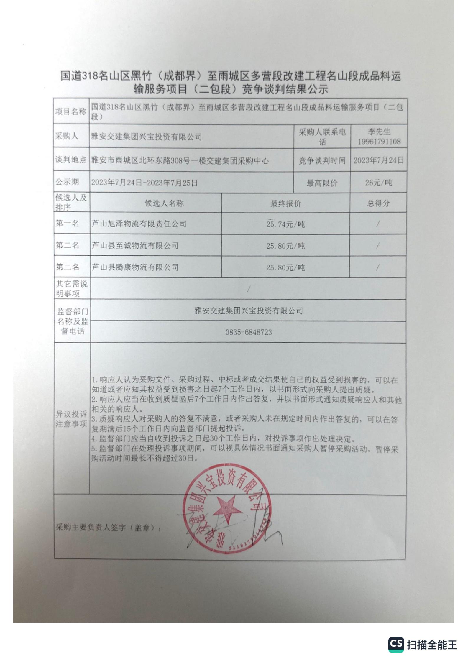 雅安交建集團(tuán)興寶投資有限公司國道318名山區(qū)黑竹(成都界)至雨城區(qū)多營段改建工程名山段成品料運(yùn)輸服務(wù)項(xiàng)目(二包段)競(jìng)爭(zhēng)談判結(jié)果公示