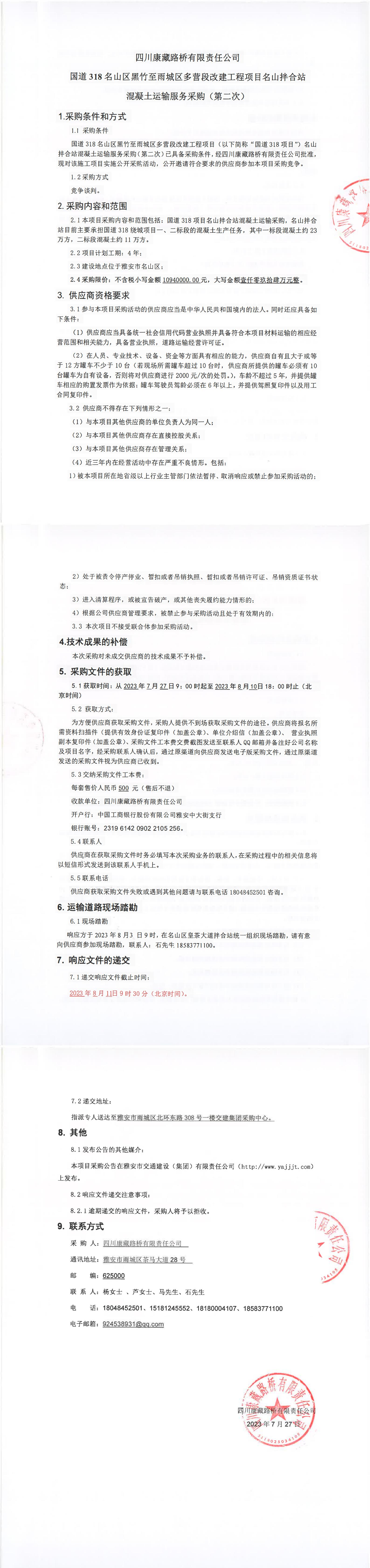 四川康藏路橋有限責任公司國道318名山區(qū)黑竹至雨城區(qū)多營段改建工程項目名山拌合站混凝土運輸服務采購(第二次)