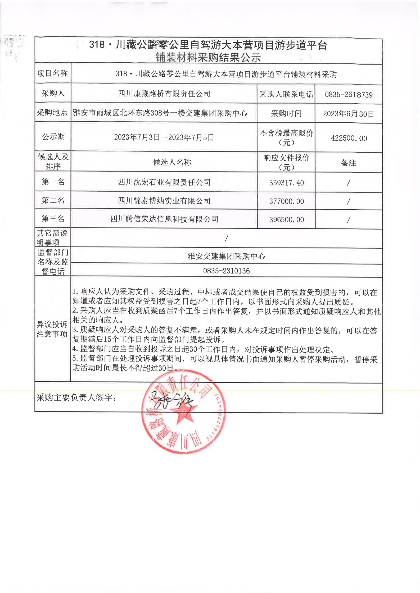 四川康藏路橋有限責(zé)任公司318·川藏公路零公里自駕游大本營項(xiàng)目游步道平臺(tái)鋪裝材料采購結(jié)果公示