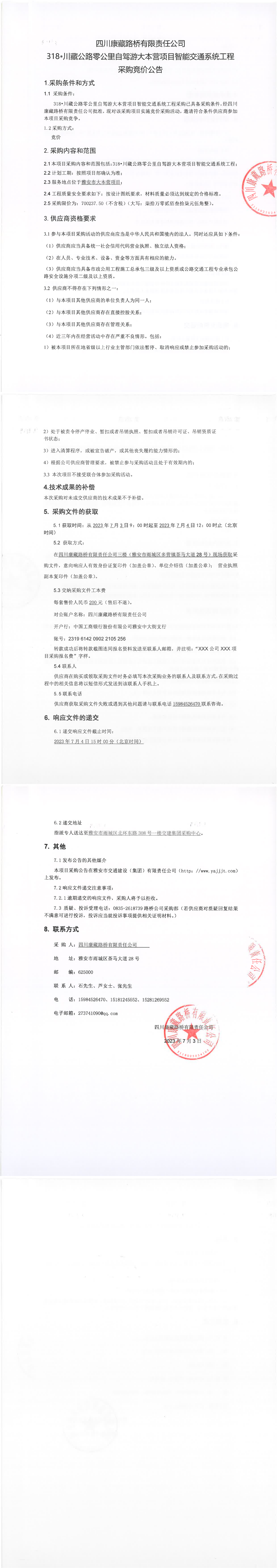 四川康藏路橋有限責(zé)任公司318·川藏公路零公里自駕游大本營項目智能交通系統(tǒng)工程采購競價公告