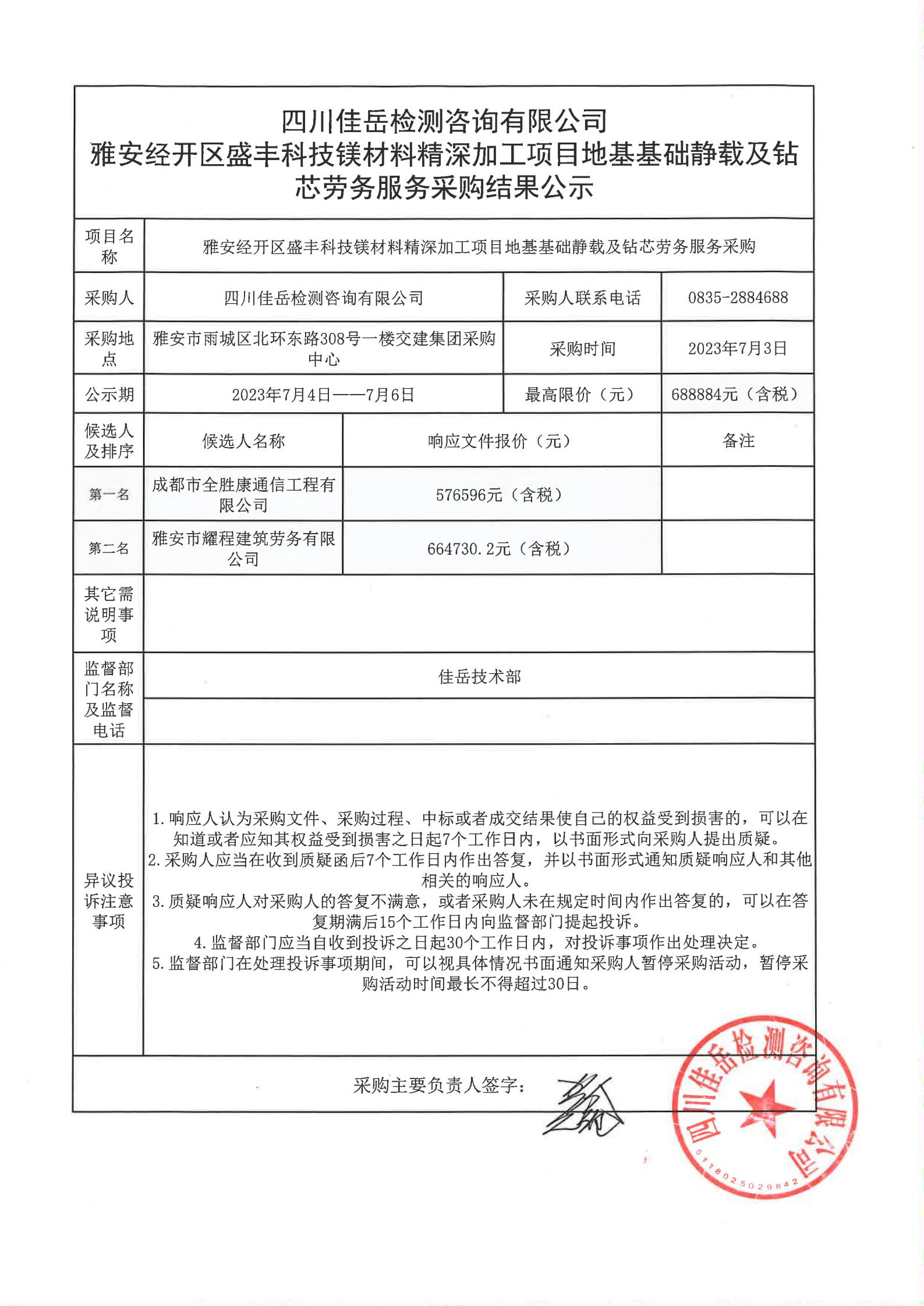 四川佳岳檢測(cè)咨詢(xún)有限公司雅安經(jīng)開(kāi)區(qū)盛豐科技鎂材料精深加工項(xiàng)目地基基礎(chǔ)靜載及鉆芯服務(wù)采購(gòu)結(jié)果公示