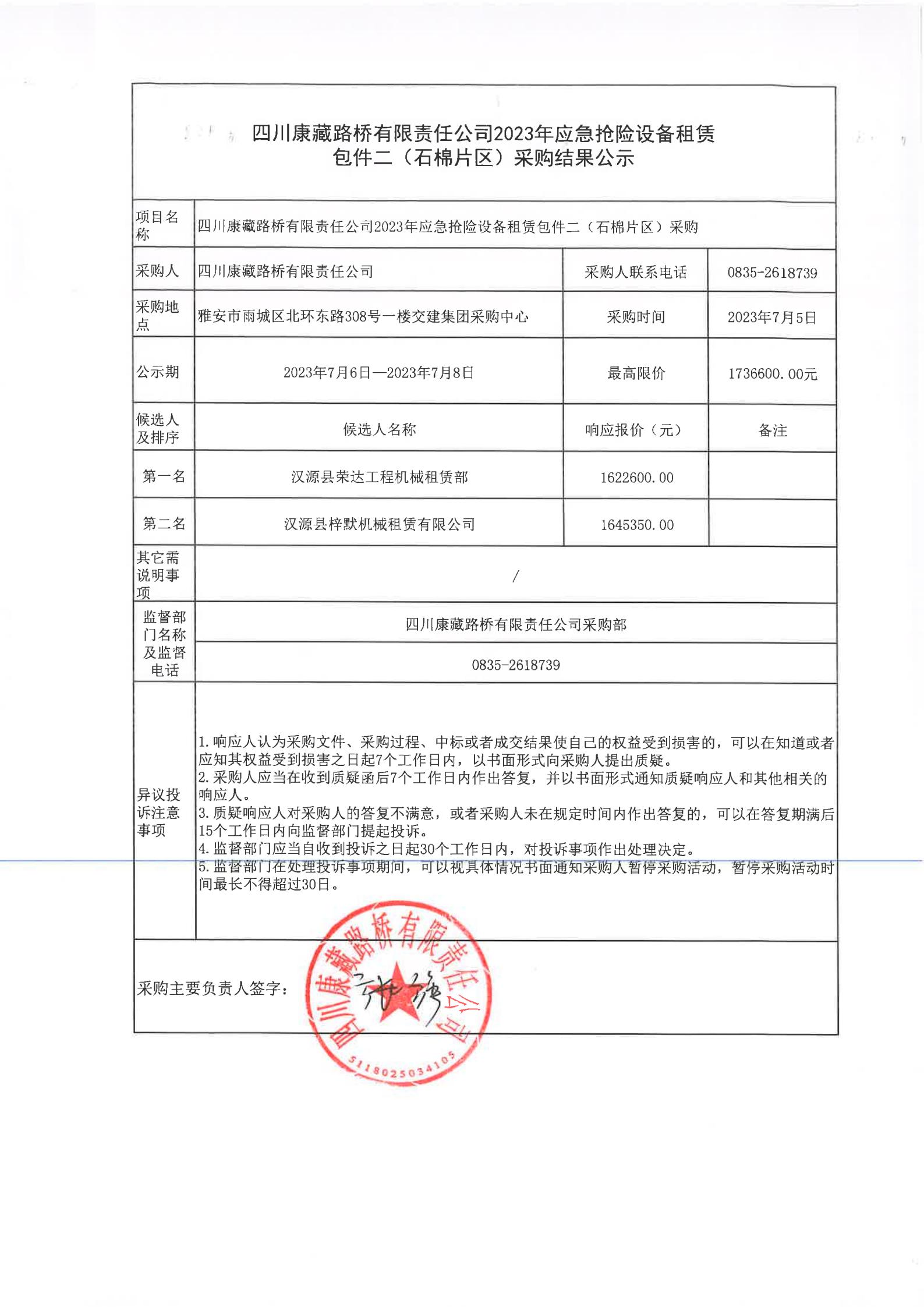 四川康藏路橋有限責任公司2023年應急搶險設備租賃包件二(石棉片區(qū))采購結(jié)果公示