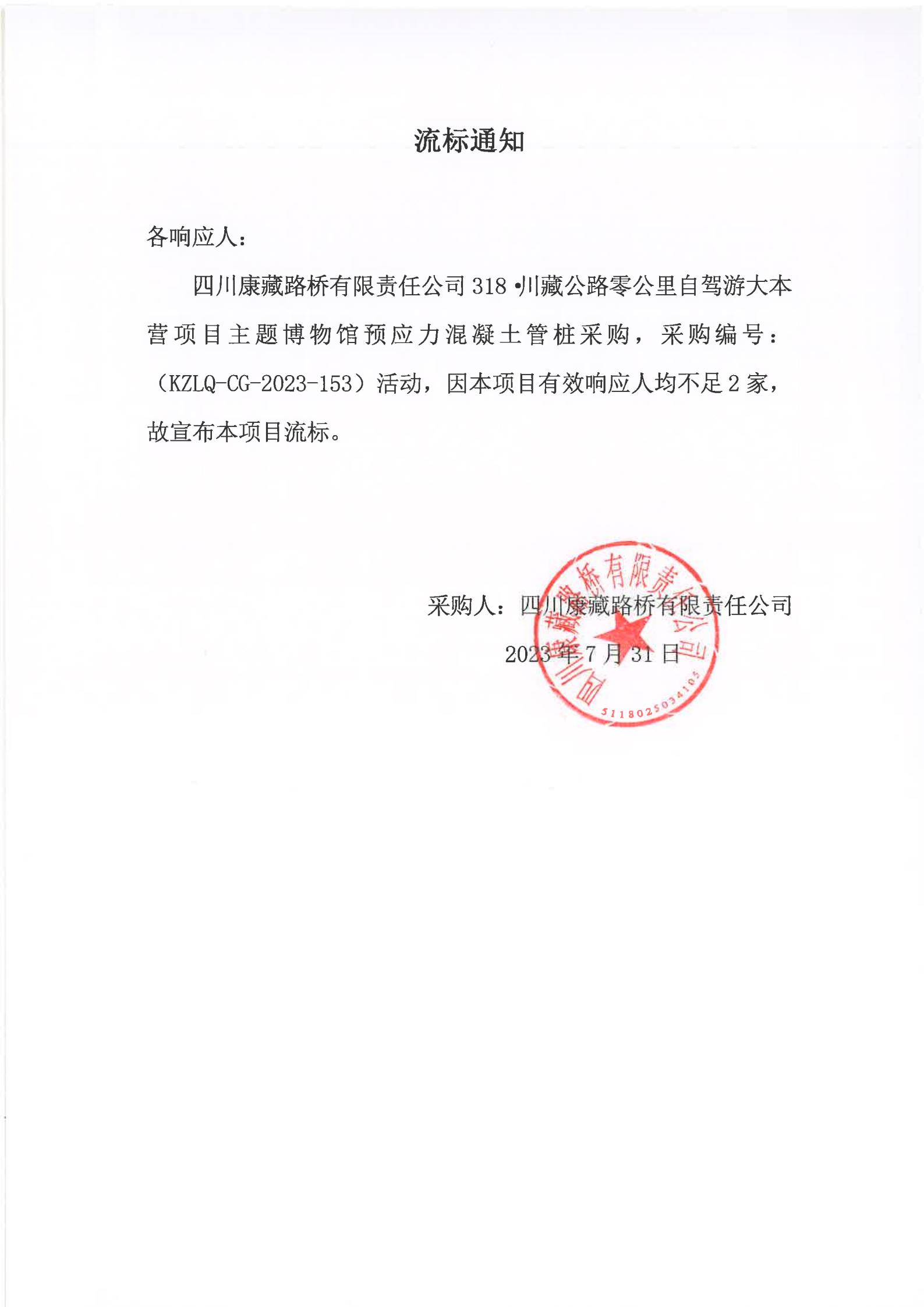 四川康藏路橋有限責(zé)任公司318·川藏公路零公里自駕游大本營(yíng)項(xiàng)目主題博物館預(yù)應(yīng)力混凝土管樁采購(gòu)流標(biāo)通知