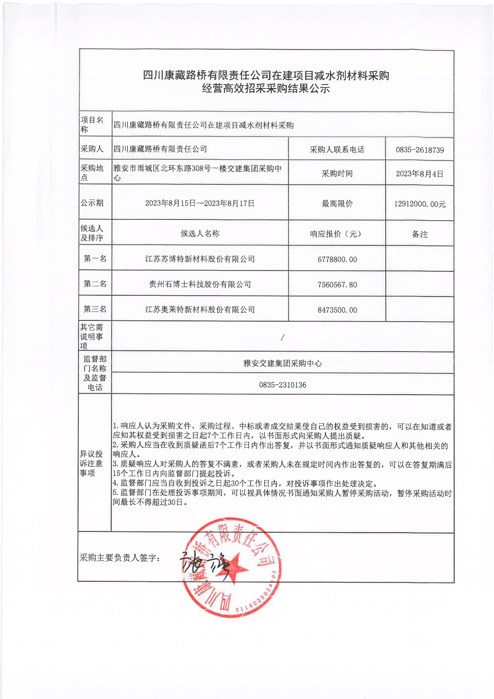 四川康藏路橋有限責任公司在建項目減水劑材料采購經(jīng)營高效招采采購結果公示