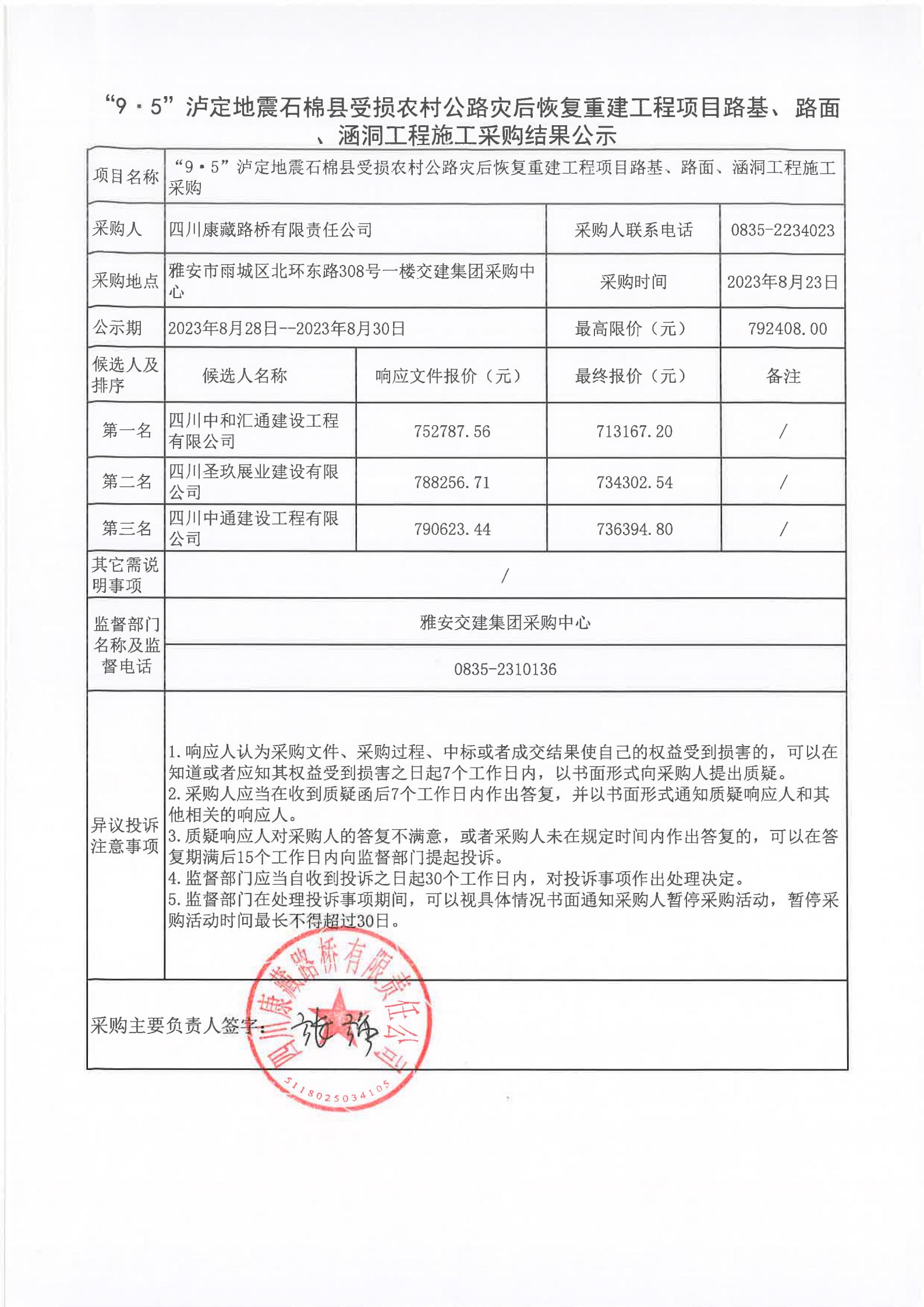 四川康藏路橋有限責任公司“9·5”瀘定地震石棉縣受損農村公路災后恢復重建工程項目路基、路面、涵洞工程施工采購結果公示
