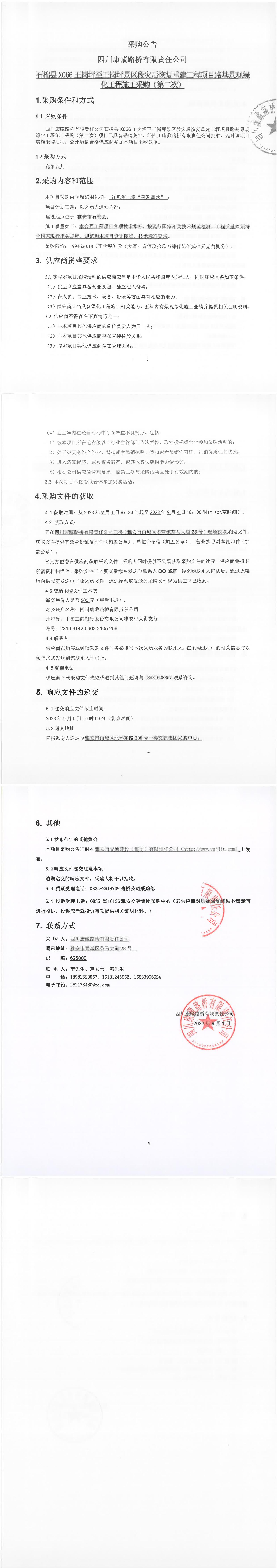 四川康藏路橋有限責(zé)任公司石棉縣X066王崗坪至王崗坪景區(qū)段災(zāi)后恢復(fù)重建工程項目路基景觀綠化工程施工采購(第二次)