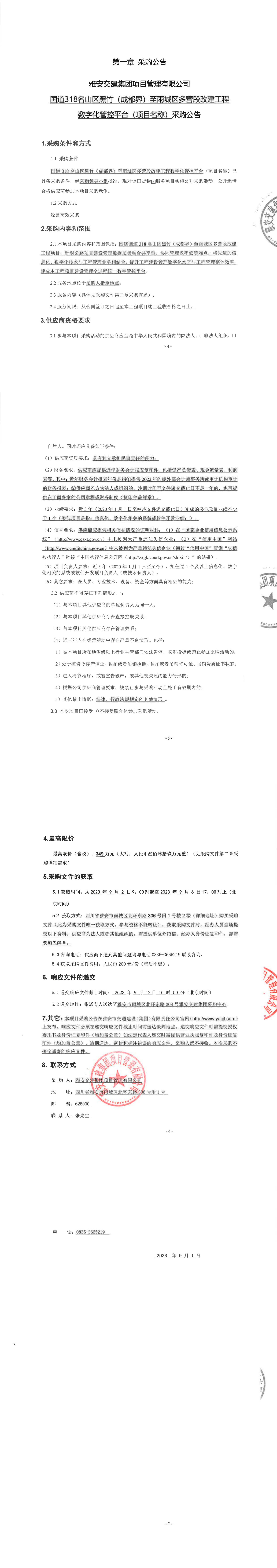 雅安交建集團項目管理有限公司國道318名山區(qū)黑竹(成都界)至雨城區(qū)多營段改建工程數(shù)字化管控平臺(項目名稱)采購公告