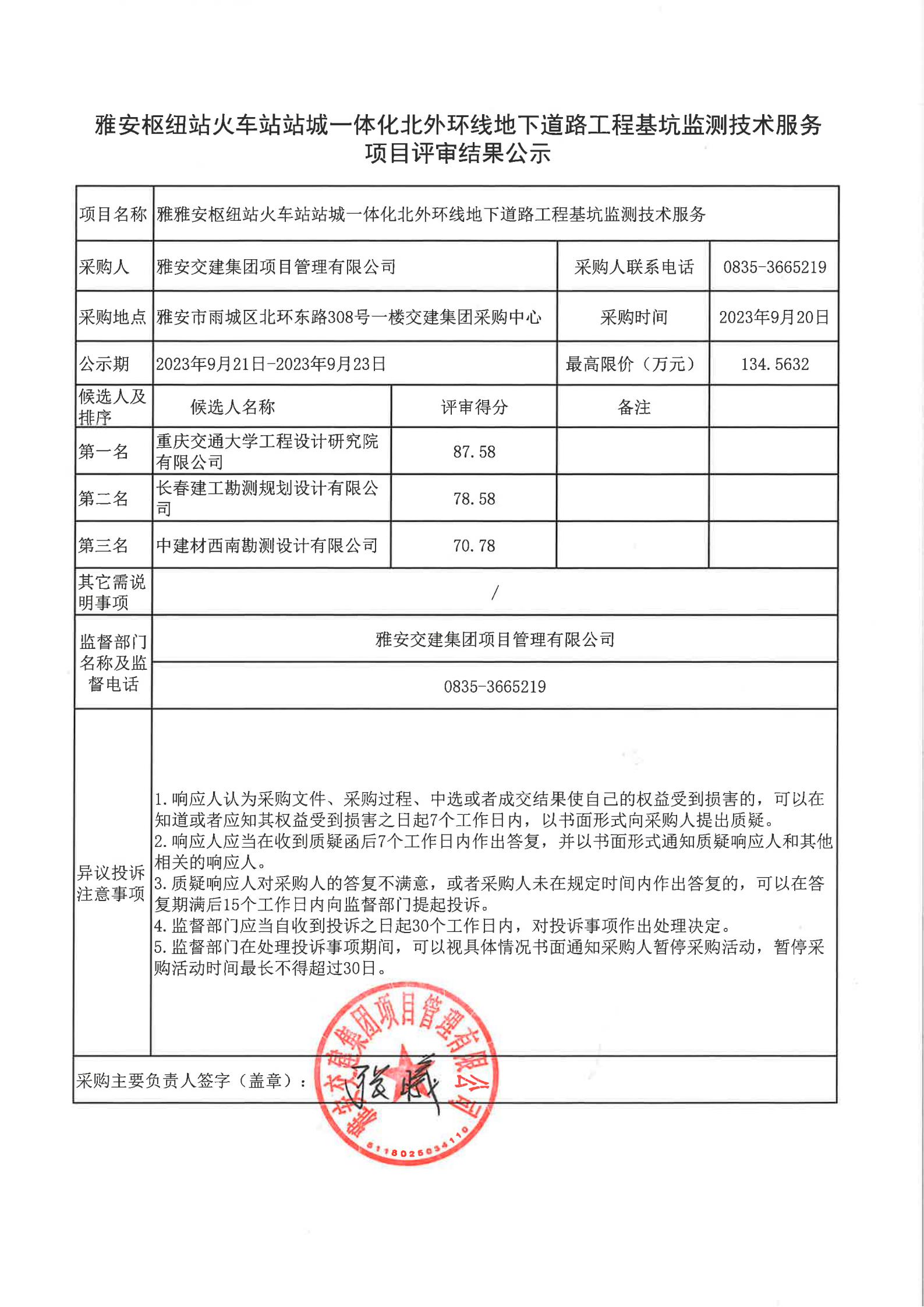 雅安交建集團(tuán)項(xiàng)目管理有限公司雅安樞紐站火車站站城一體化北外環(huán)線地下道路工程基坑監(jiān)測(cè)技術(shù)服務(wù)項(xiàng)目評(píng)審結(jié)果公示