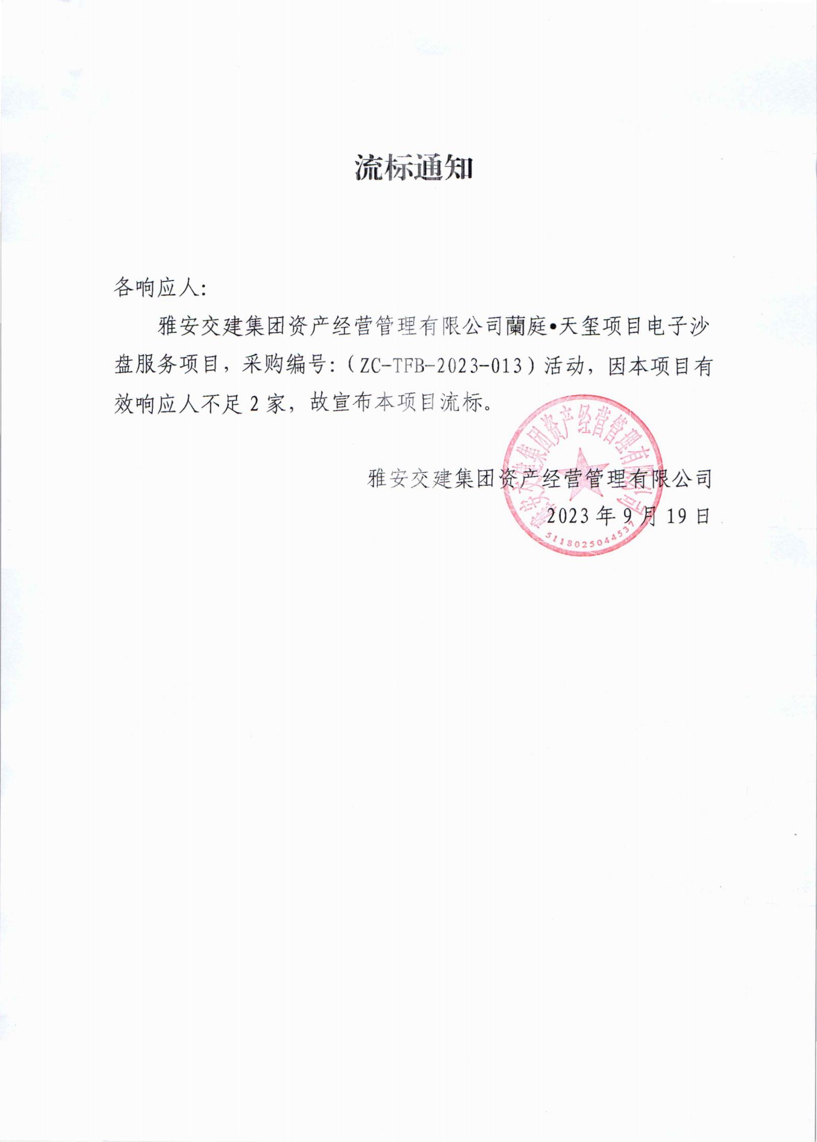 雅安交建集團資產(chǎn)經(jīng)營管理有限公司蘭庭•天璽項目電子沙盤服務(wù)項目流標通知書