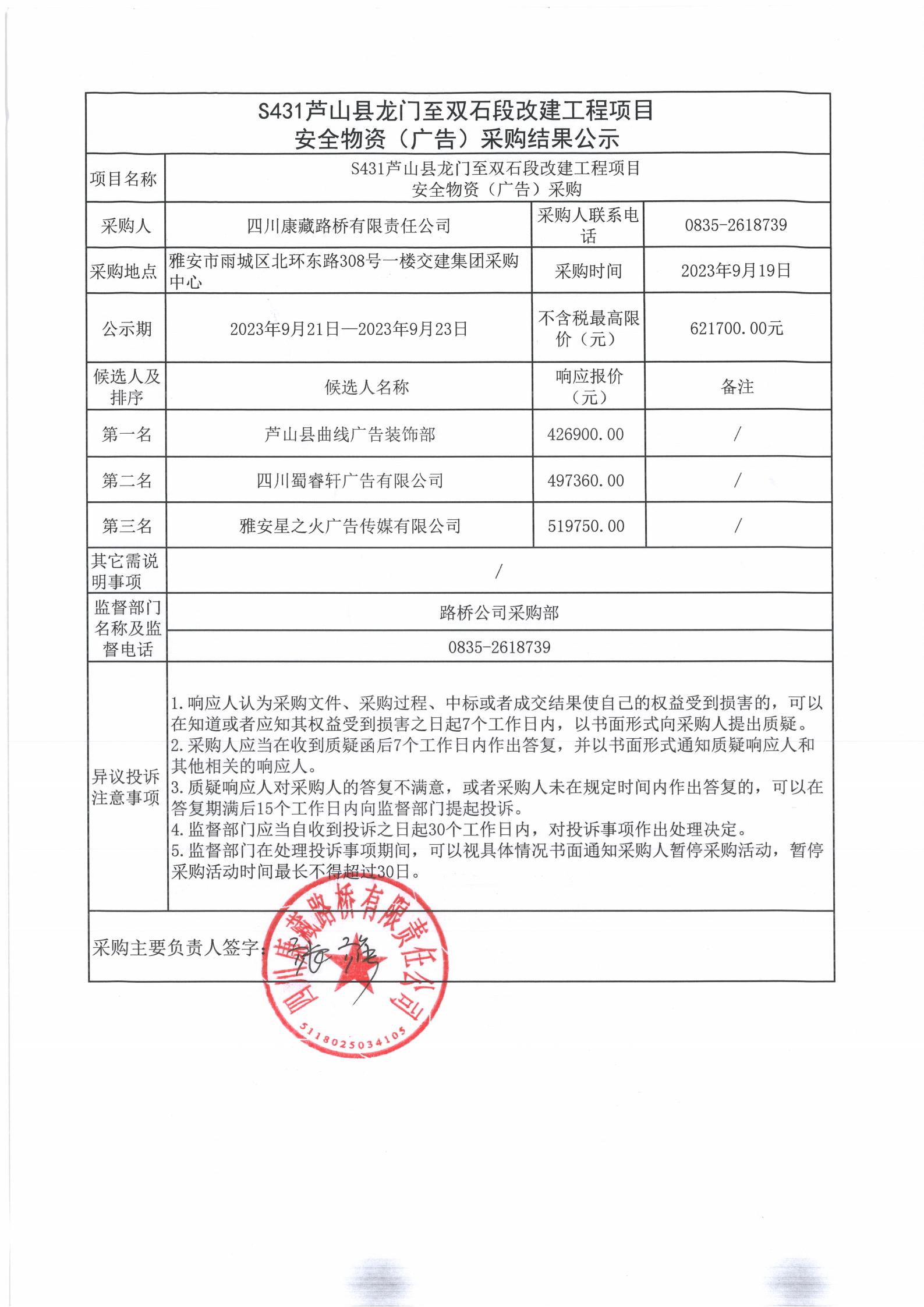 四川康藏路橋有限責任公司S431蘆山縣龍門至雙石段改建工程項目安全物資(廣告)采購結(jié)果公示