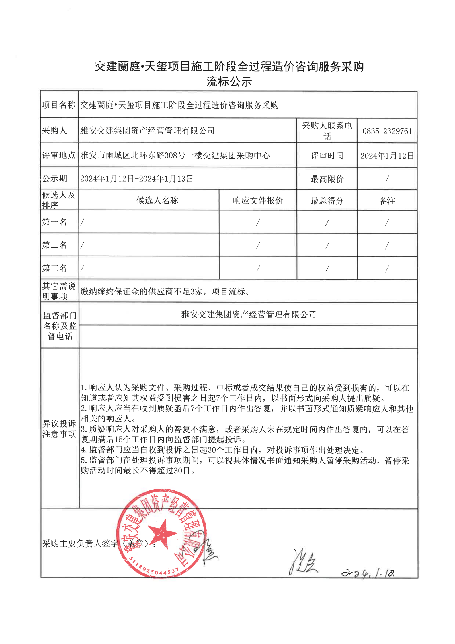 雅安交建集團(tuán)資產(chǎn)經(jīng)營管理有限公司交建蘭庭·天璽項(xiàng)目施工階段全過程造價咨詢服務(wù)采購流標(biāo)公示