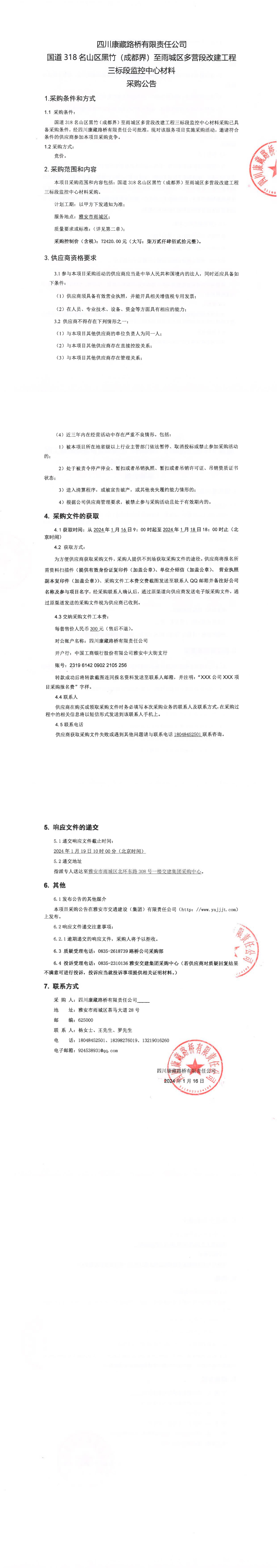 四川康藏路橋有限責(zé)任公司國道318名山區(qū)黑竹(成都界)至雨城區(qū)多營段改建工程三標(biāo)段監(jiān)控中心材料采購公告