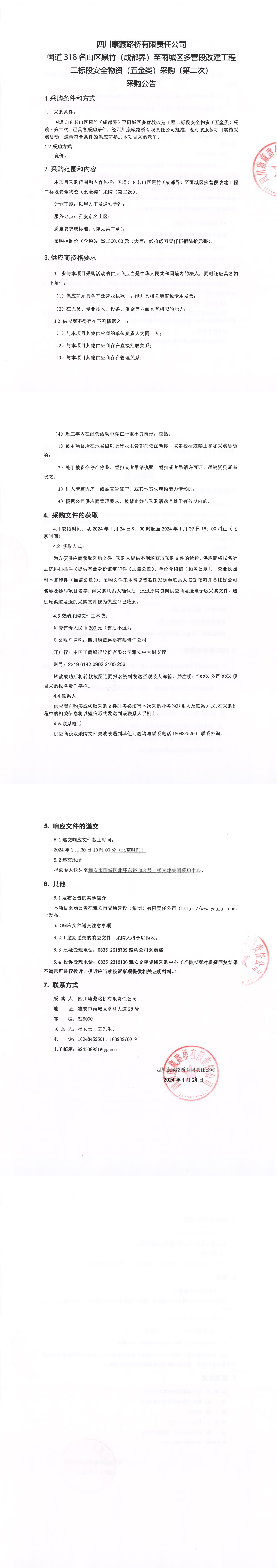 四川康藏路橋有限責(zé)任公司國(guó)道318名山區(qū)黑竹(成都界)至雨城區(qū)多營(yíng)段改建工程二標(biāo)段安全物資(五金類)采購(gòu)(第二次)采購(gòu)公告