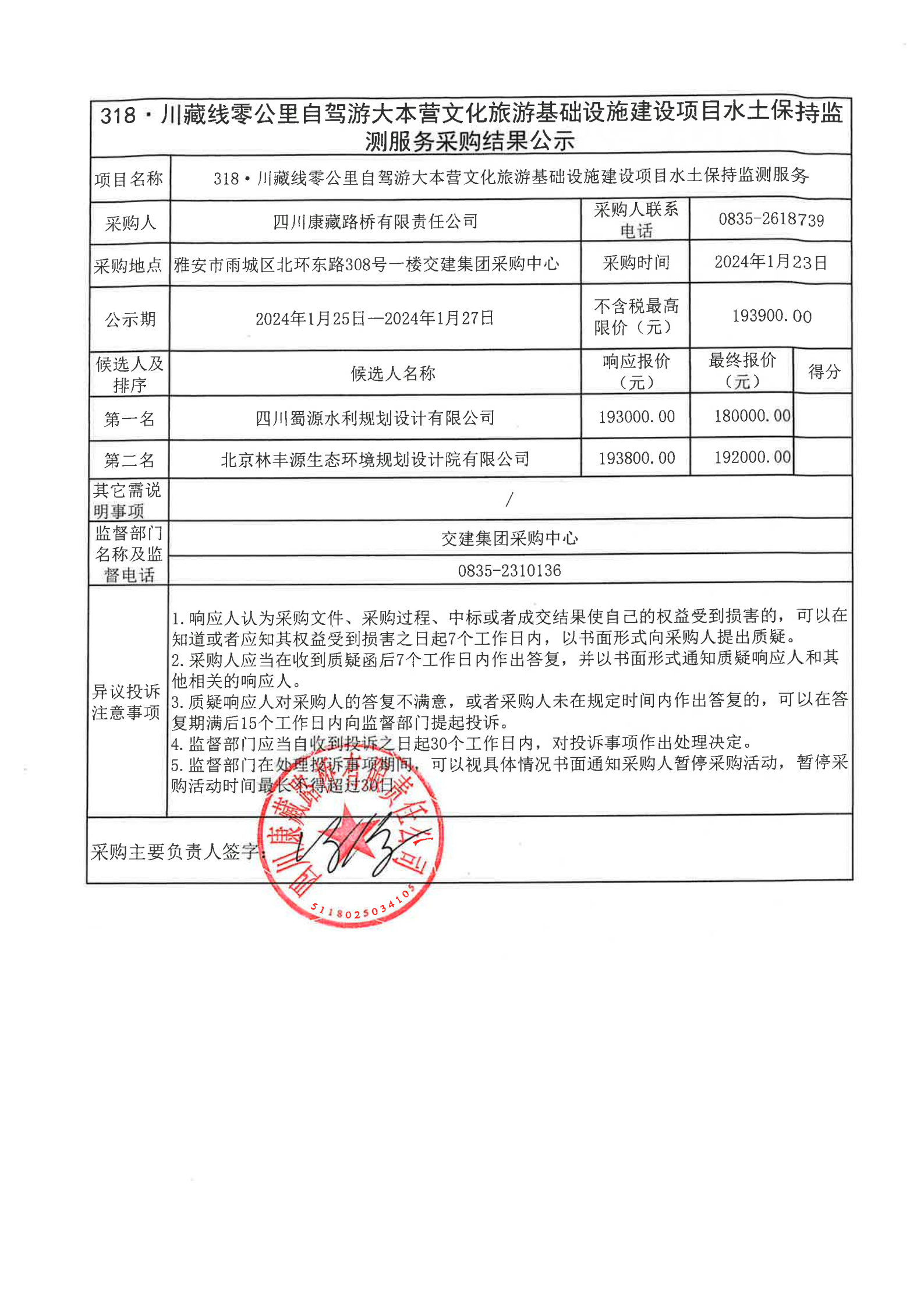 四川康藏路橋有限責(zé)任公司318·川藏線(xiàn)零公里自駕游大本營(yíng)文化旅游基礎(chǔ)設(shè)施建設(shè)項(xiàng)目水土保持監(jiān)測(cè)服務(wù)采購(gòu)結(jié)果公示
