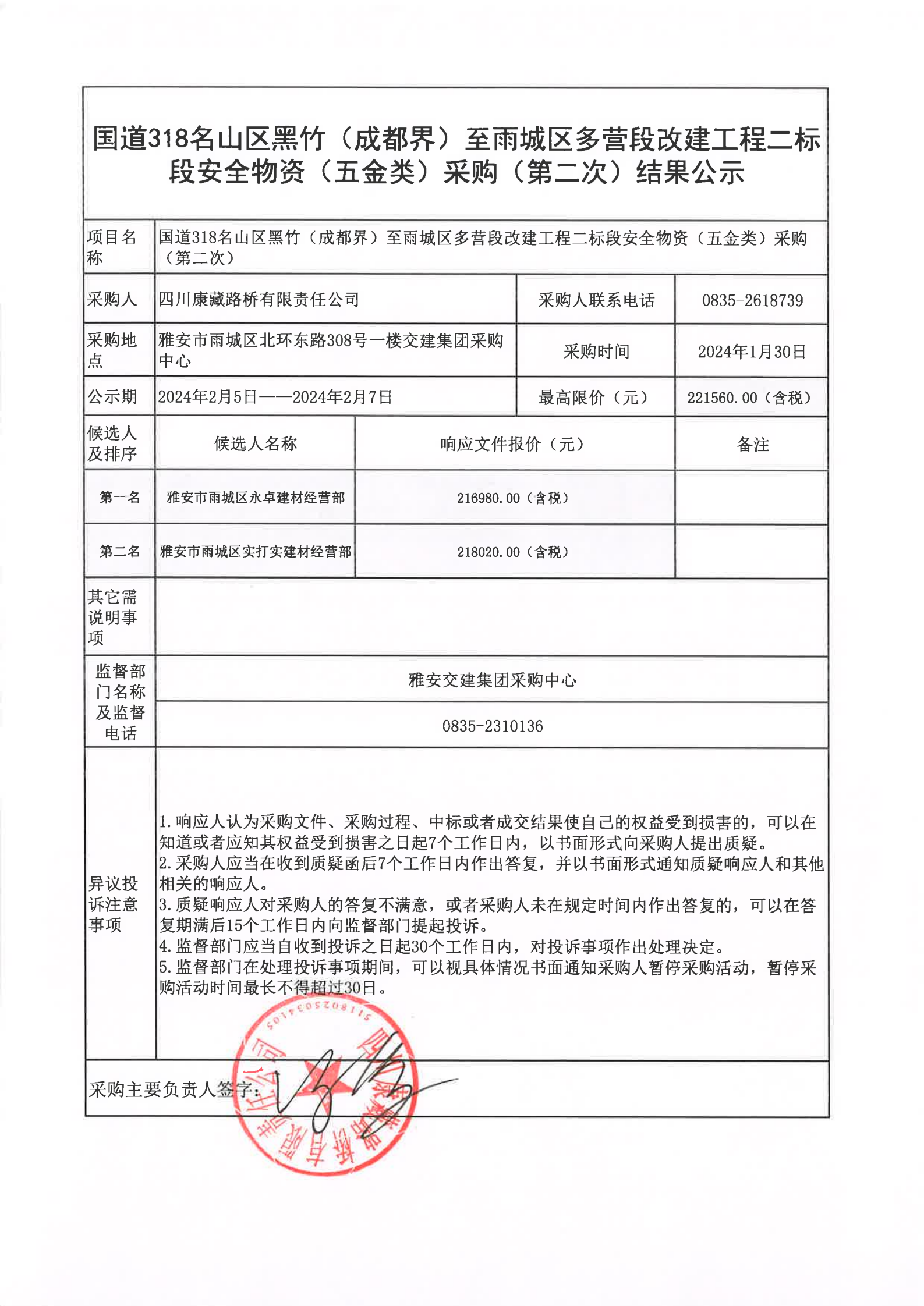 四川康藏路橋有限責(zé)任公司國道318名山區(qū)黑竹(成都界)至雨城區(qū)多營段改建工程二標段安全物資(五金類)采購(第二次)結(jié)果公示