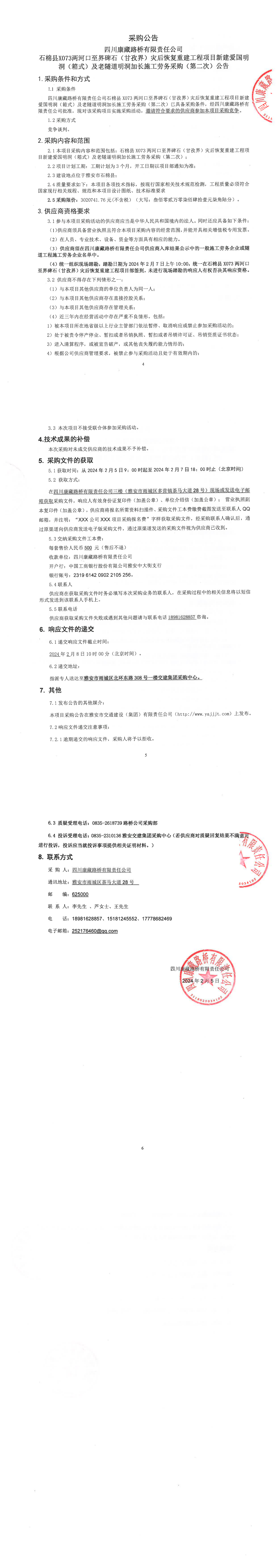 四川康藏路橋有限責(zé)任公司石棉縣X073兩河口至界碑石(甘孜界)災(zāi)后恢復(fù)重建工程項(xiàng)目新建愛國明洞(箱式)及老隧道明洞加長施工勞務(wù)采購(第二次)公告