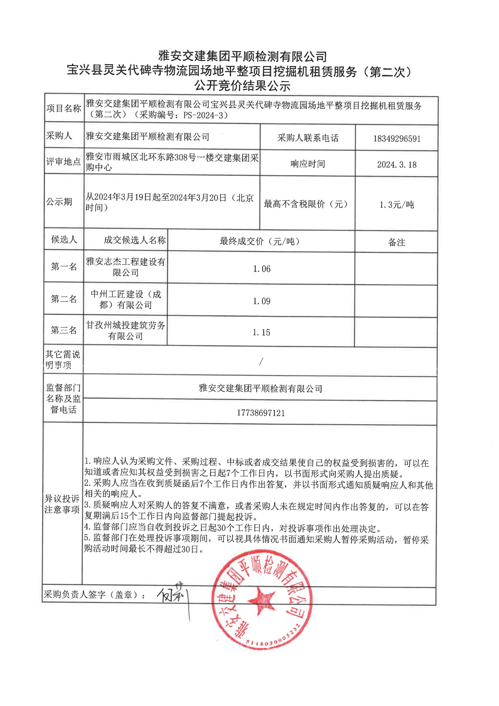 雅安交建集團平順檢測有限公司寶興縣靈關(guān)代碑寺物流園場地平整項目挖掘機租賃服務(wù)(第二次)競價結(jié)果公示