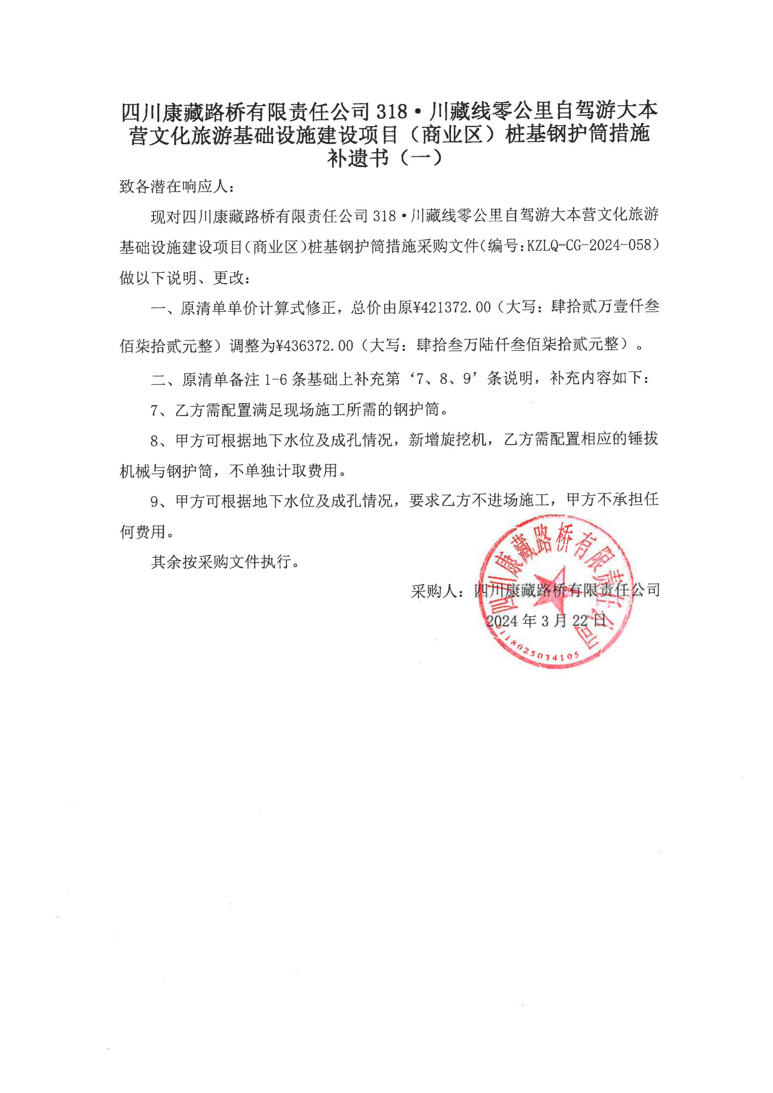 四川康藏路橋有限責(zé)任公司318·川藏公路零公里自駕游大本營文化旅游基礎(chǔ)設(shè)施建設(shè)項(xiàng)目(商業(yè)區(qū))樁基鋼護(hù)筒措施補(bǔ)遺書(一)