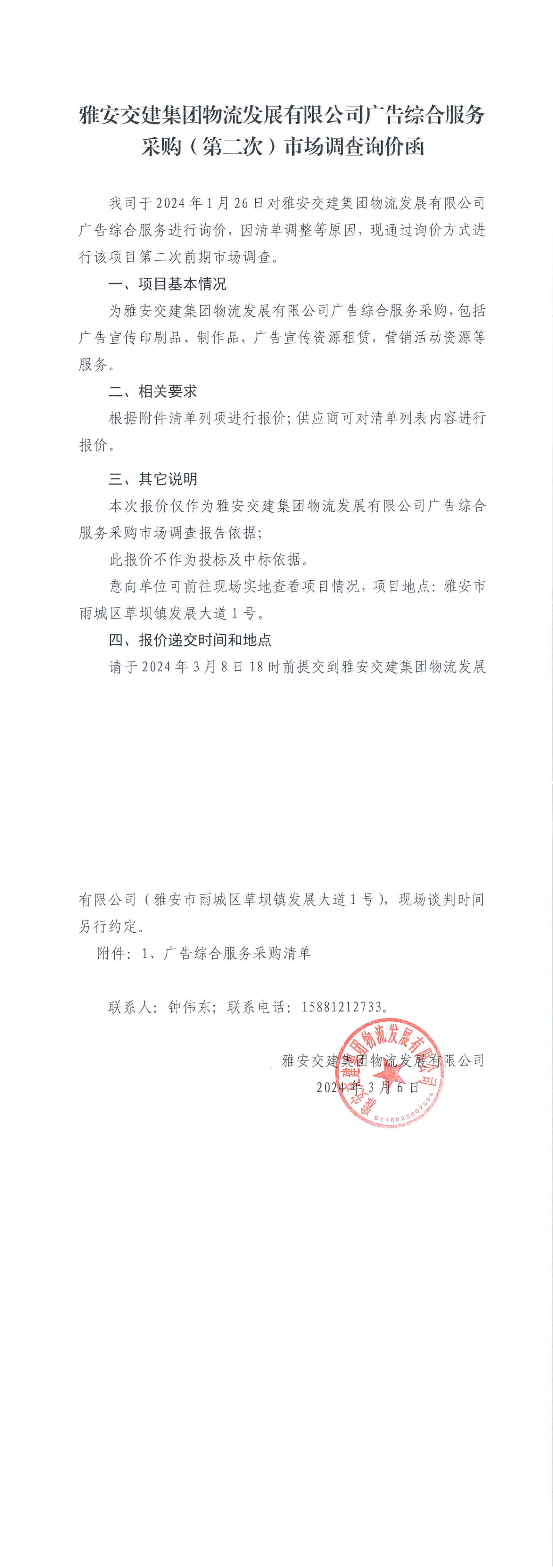 雅安交建集團物流發(fā)展有限公司廣告綜合服務(wù)采購(第二次)市場調(diào)查詢價函