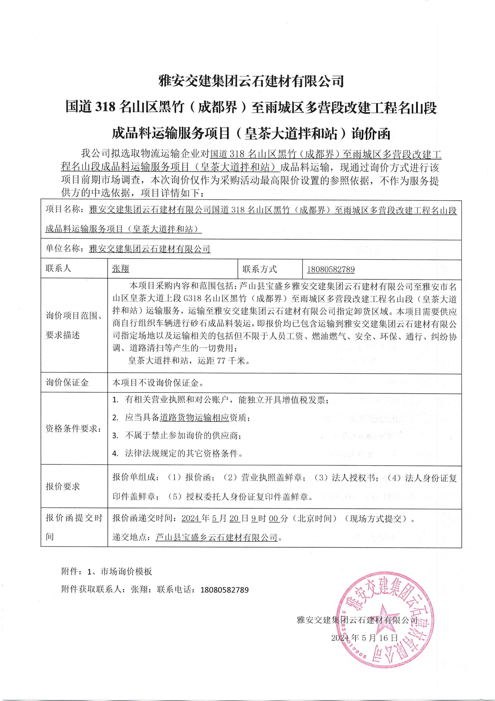雅安交建集團(tuán)云石建材有限公司S431蘆山縣龍門至雙石段改建工程成品料運(yùn)輸服務(wù)項(xiàng)目詢價(jià)函
