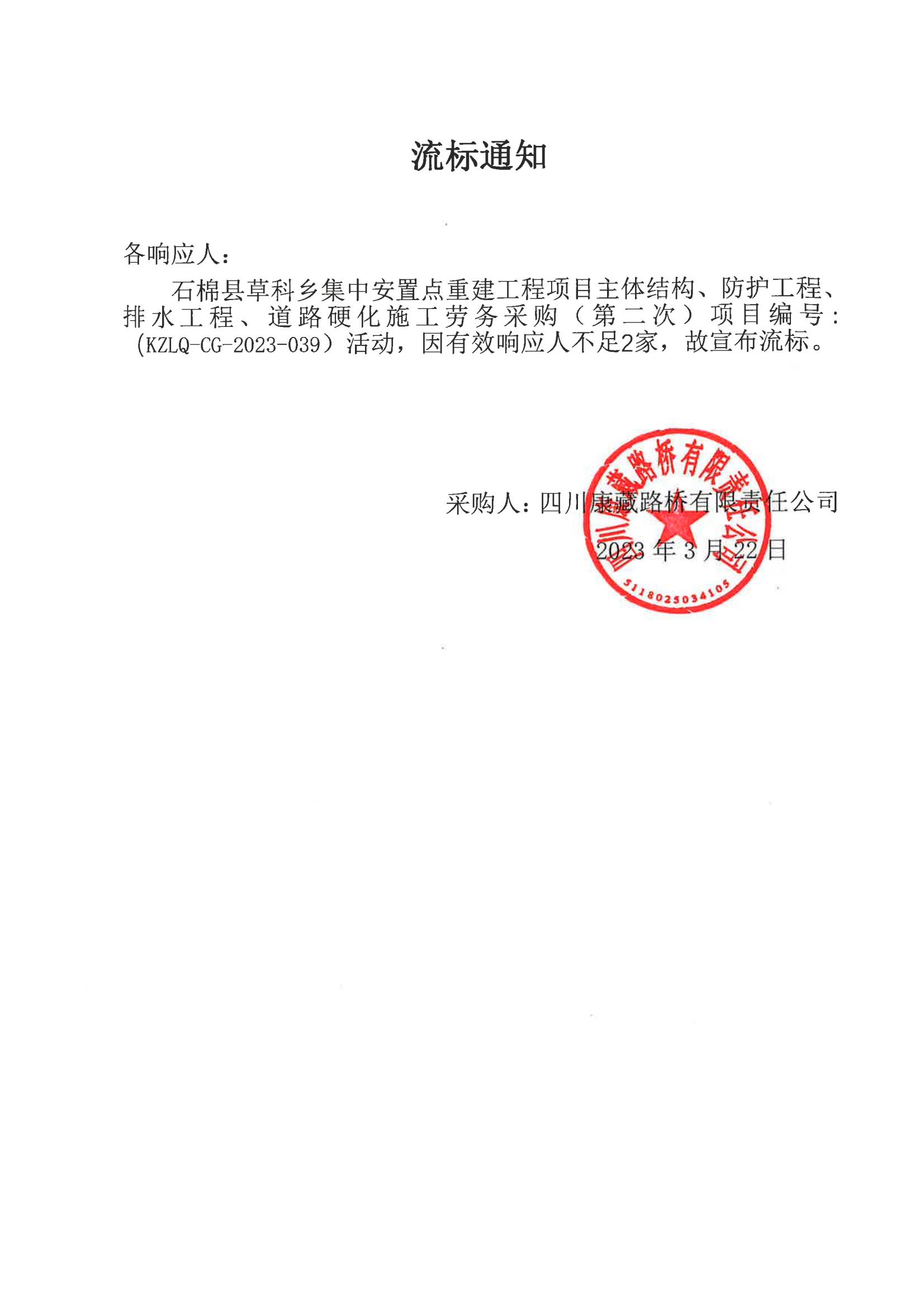 四川康藏路橋有限責(zé)任公司石棉草科鄉(xiāng)集中安置點(diǎn)重建工程項(xiàng)目主體結(jié)構(gòu)、防護(hù)工程、排水工程、道路硬化施工勞務(wù)采購(gòu)流標(biāo)通知(第二次)