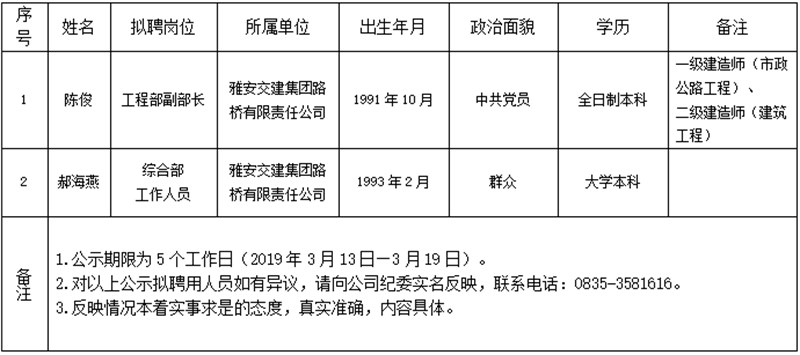 雅安交建集團子公司擬聘用人員公示(路橋公司)
