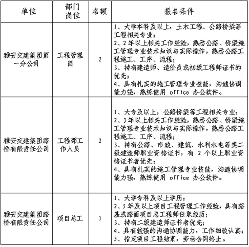 根據(jù)發(fā)展需要,決定面向社會公開招聘雅安市交通建設(集團)有限責任公司(以下簡稱“雅安交建集團”)所屬分子公司工作人員5名,現(xiàn)將有關事項公告如下: