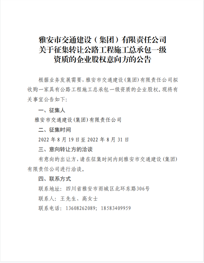 關(guān)于征集轉(zhuǎn)讓公路工程施工總承包一級資質(zhì)的企業(yè)股權(quán)意向合作方的公告