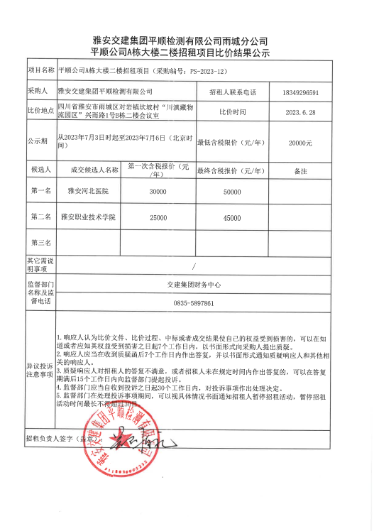 平順公司A棟大樓二樓招租項(xiàng)目比價(jià)結(jié)果公示