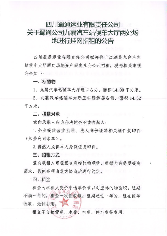 四川蜀通運(yùn)業(yè)郵箱責(zé)任公司關(guān)于蜀通公司九襄汽車站候車大廳兩處場地進(jìn)行掛網(wǎng)招租的公告附件