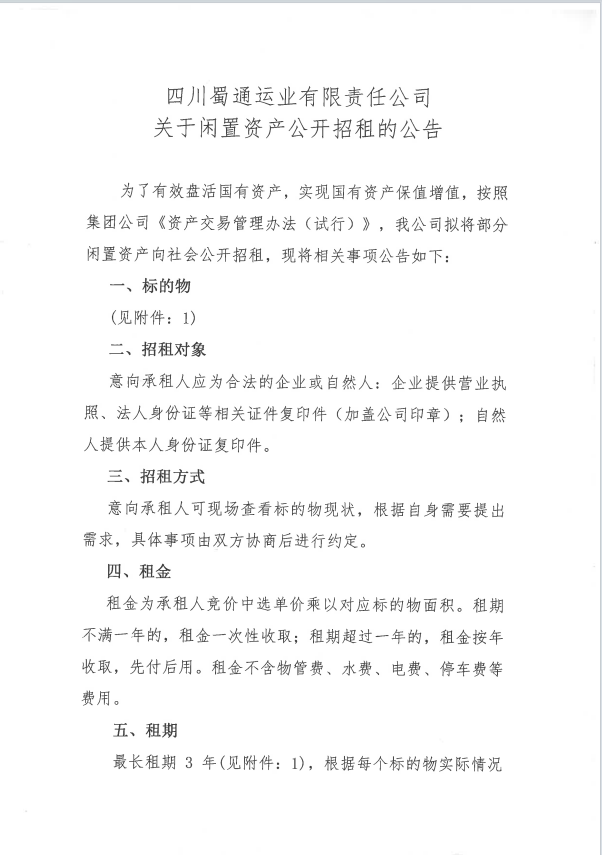 蜀通運(yùn)業(yè)有限責(zé)任公司關(guān)于閑置資產(chǎn)公開招租的公告附件