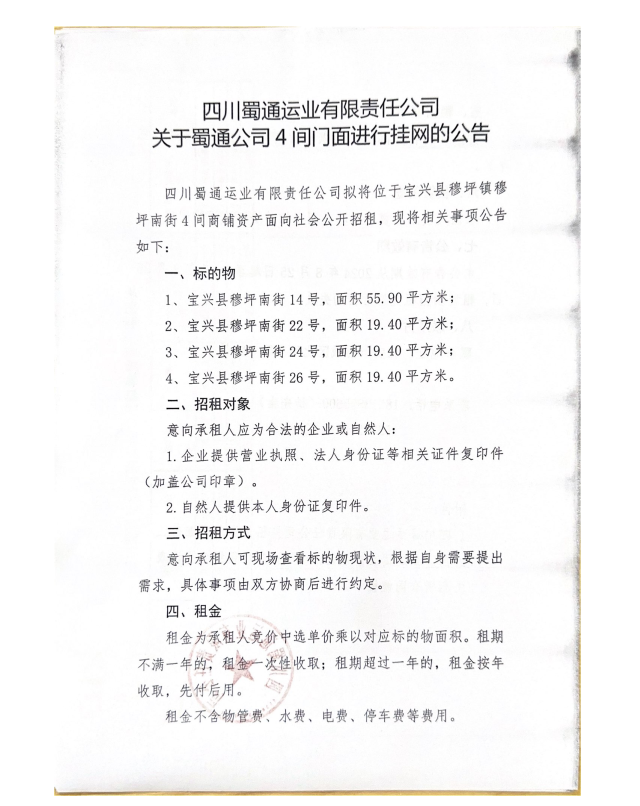 四川蜀通運(yùn)業(yè)有限責(zé)任公司關(guān)于蜀通公司4間門面進(jìn)行掛網(wǎng)的公告附件