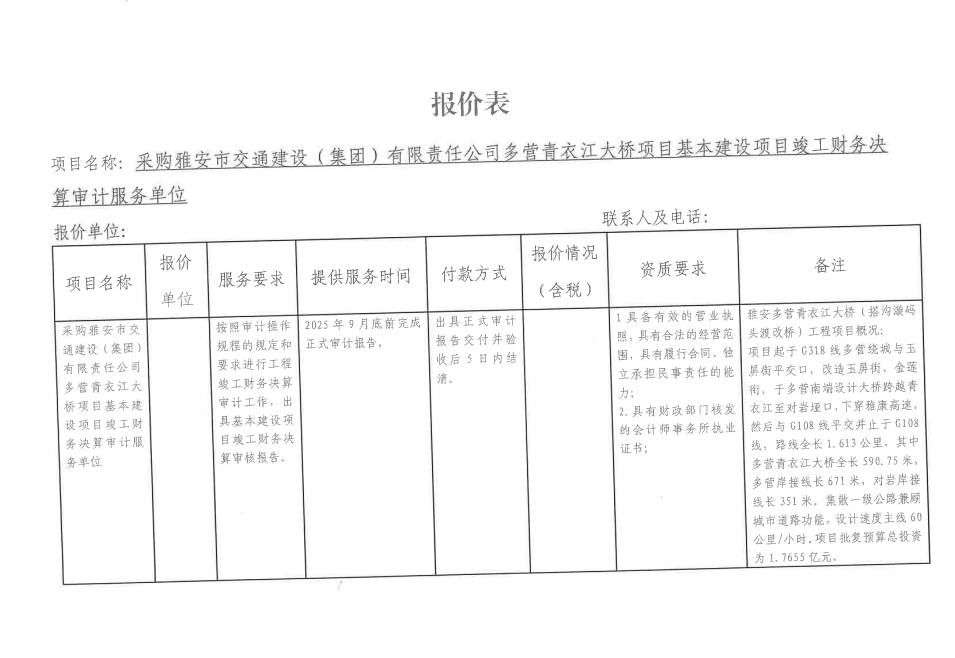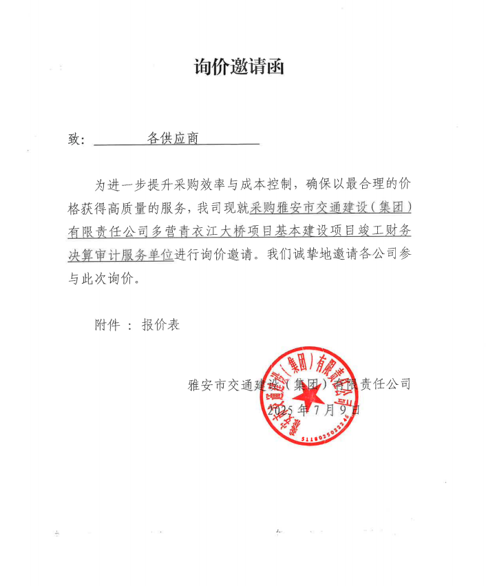 詢價邀請函——采購雅安市交通建設(shè)(集團(tuán))有限責(zé)任公司多營青衣江大橋項目基本建設(shè)項目竣工財務(wù)決算審計服務(wù)單位