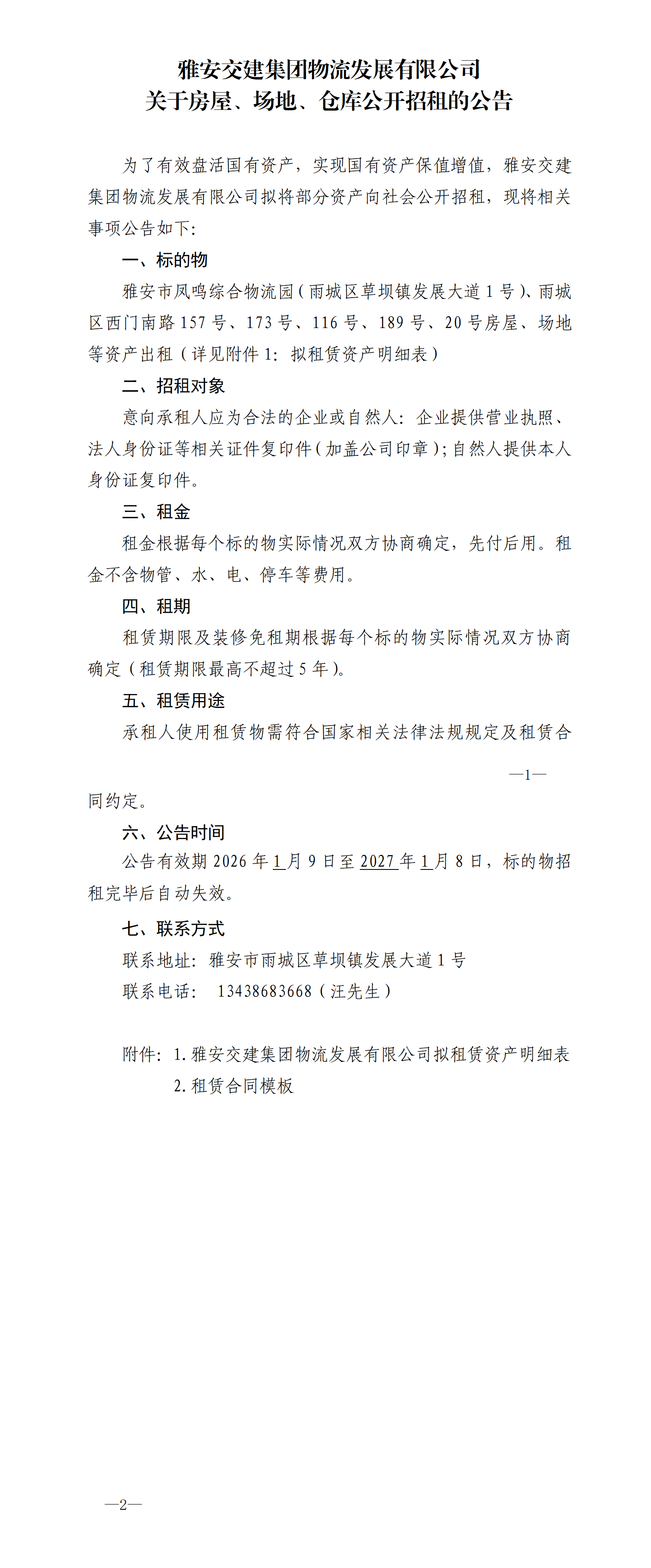 雅安交建集團(tuán)物流發(fā)展有限公司關(guān)于房屋、場(chǎng)地、倉(cāng)庫(kù)公開招租的公告