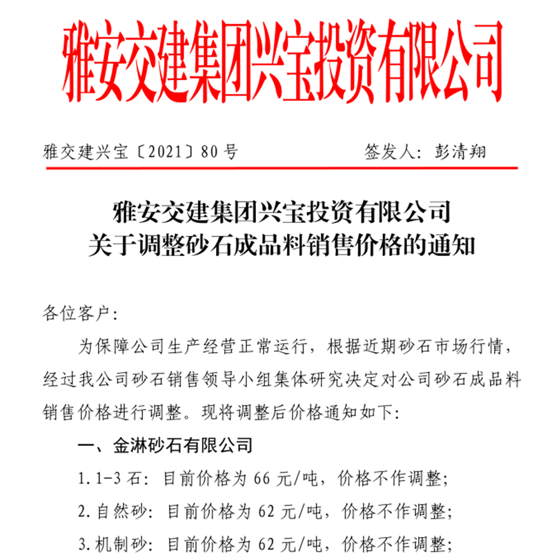 雅安交建集團(tuán)云石公司關(guān)于調(diào)整成品料銷售價(jià)格的通知(2021.11.4)