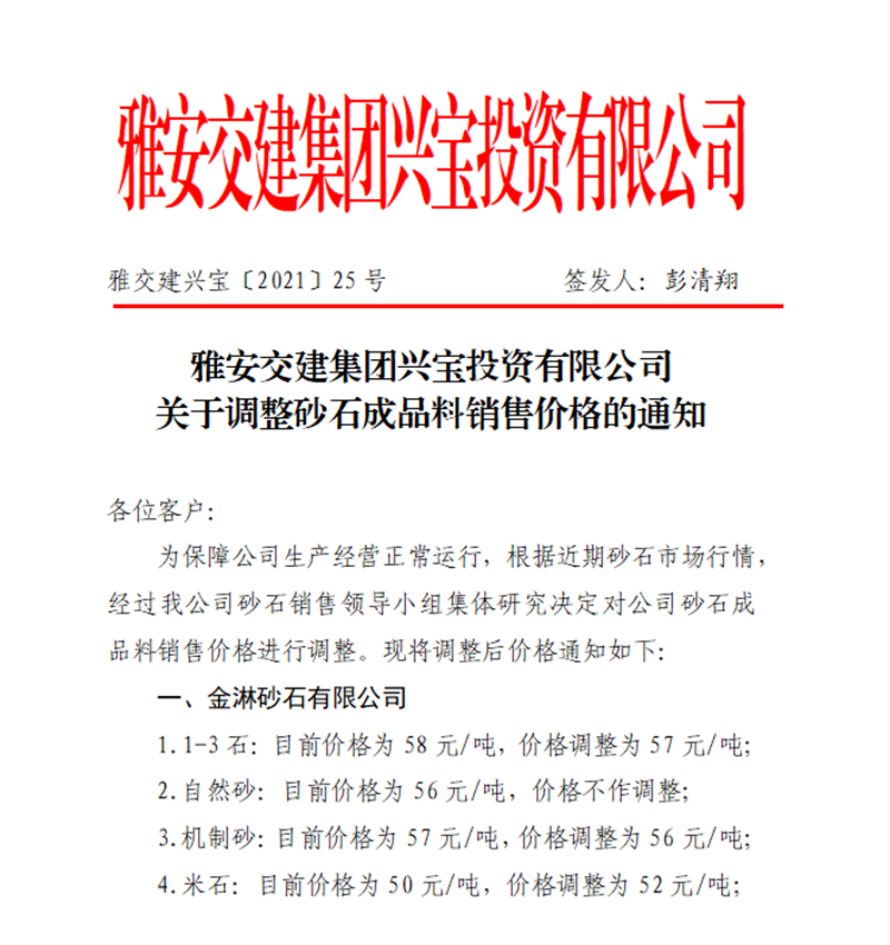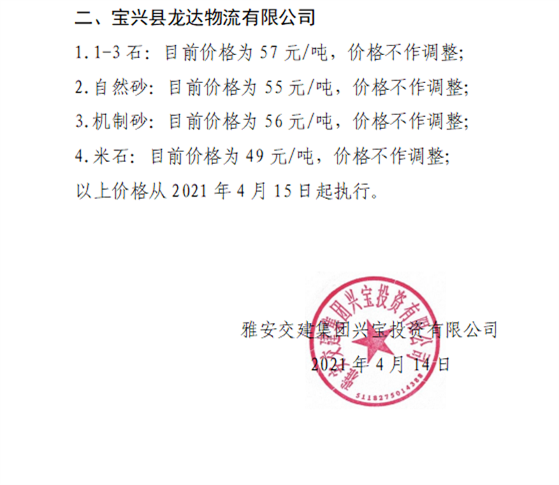 雅安交建集團(tuán)興寶公司砂石骨料銷售價(jià)格情況表(2021.4.15)