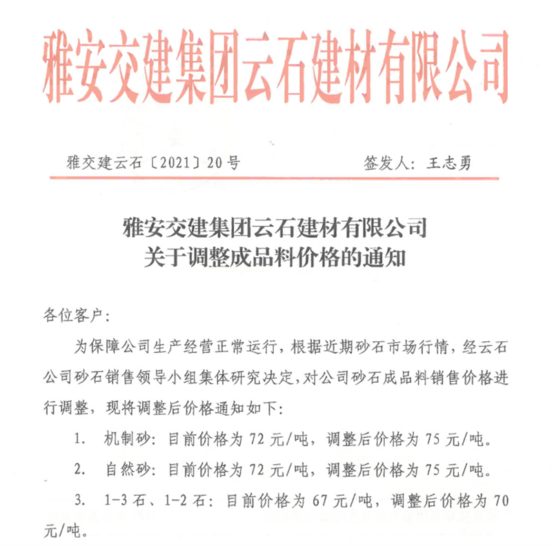 雅安交建集團(tuán)云石公司砂石骨料銷售價格情況表(2021.5.3)