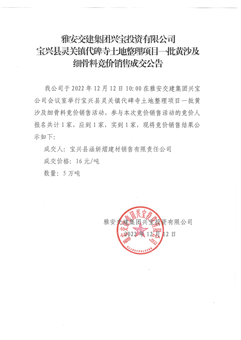 雅安交建集團興寶投資有限公司寶興縣靈關(guān)鎮(zhèn)代碑寺土地整理項目5萬噸黃沙及細骨料競價銷售成交公告(2022-12-12)
