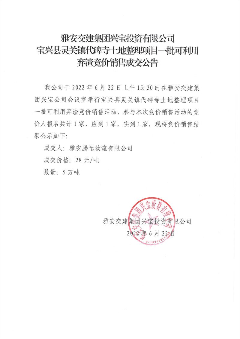 寶興縣靈關(guān)鎮(zhèn)代碑寺土地整理項目可利用棄渣成交公告