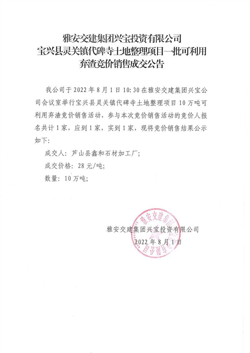 雅安交建集團興寶投資有限公司靈關(guān)鎮(zhèn)代碑寺土地整理項目10萬噸可利用棄渣競價銷售成交公告(2022.8.1)