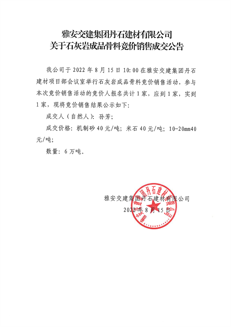 雅安交建集團(tuán)丹石建材有限公司關(guān)于石灰?guī)r成品骨料競(jìng)價(jià)銷售成交公告