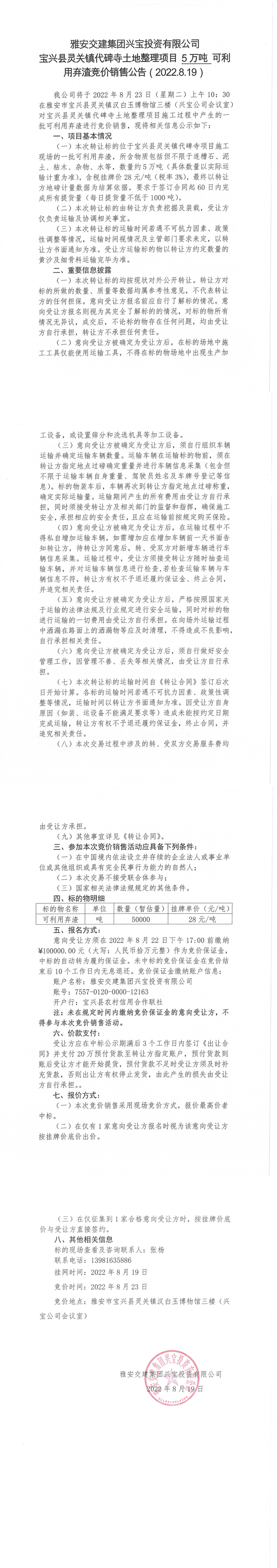 雅安交建集團(tuán)興寶投資有限公司靈關(guān)鎮(zhèn)代碑寺土地整理項目5萬噸可利用棄渣競價銷售公告(2022.8.19)(1)