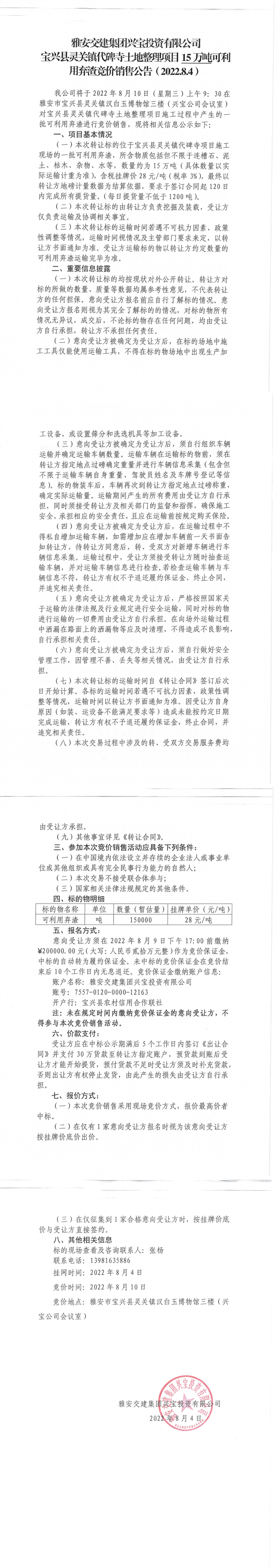 雅安交建集團(tuán)興寶投資有限公司靈關(guān)鎮(zhèn)代碑寺土地整理項(xiàng)目15萬噸可利用棄渣競價銷售公告(2022.8.4)