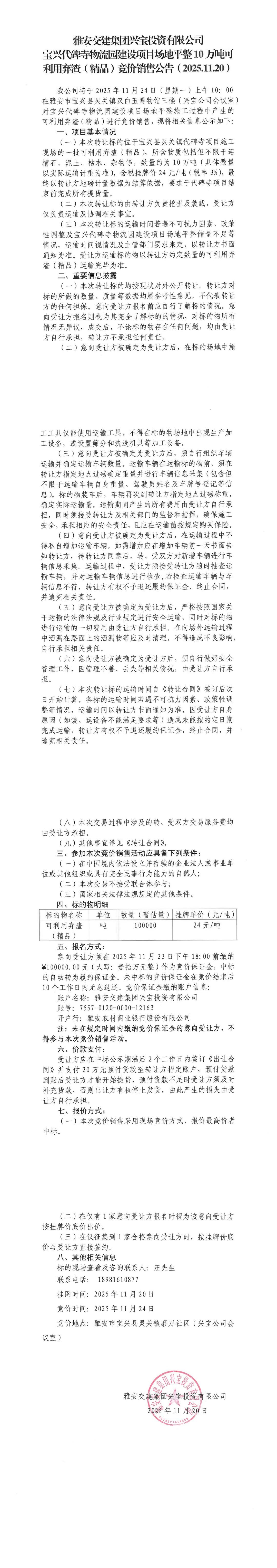 雅安交建集團(tuán)興寶投資有限公司寶興代碑寺物流園建設(shè)項(xiàng)目場(chǎng)地平整10萬(wàn)噸可利用棄渣(精品)競(jìng)價(jià)銷(xiāo)售公告(2025.11.20)